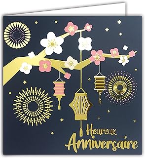 Afie 22062 Carte Carrée Heureux Anniversaire Or Doré Brillant Fleurs de Cerisier du Japon Lanternes Lampions Feu d'artifice Chinois Asiatique Fête des Lumières 22062