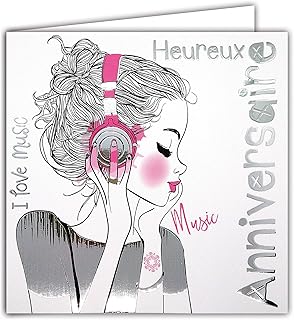 Afie 22071 Carte Heureux ANNIVERSAIRE Jeune Fille I love Music t-shirt Argenté Brillant - Carte carrée 145x145mm avec enveloppe - Fabrication Française